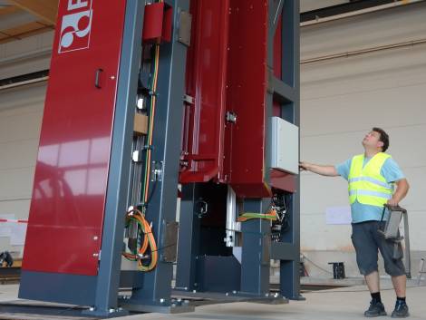 The portal saw is designed for the use in a production line for prefabricated brick walls. The outline of the wall, window or installation channel openings are cut out with this wire saw. A special software is used to operate the computerized process of this application.